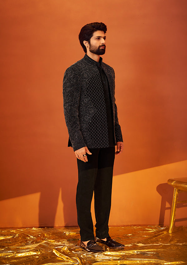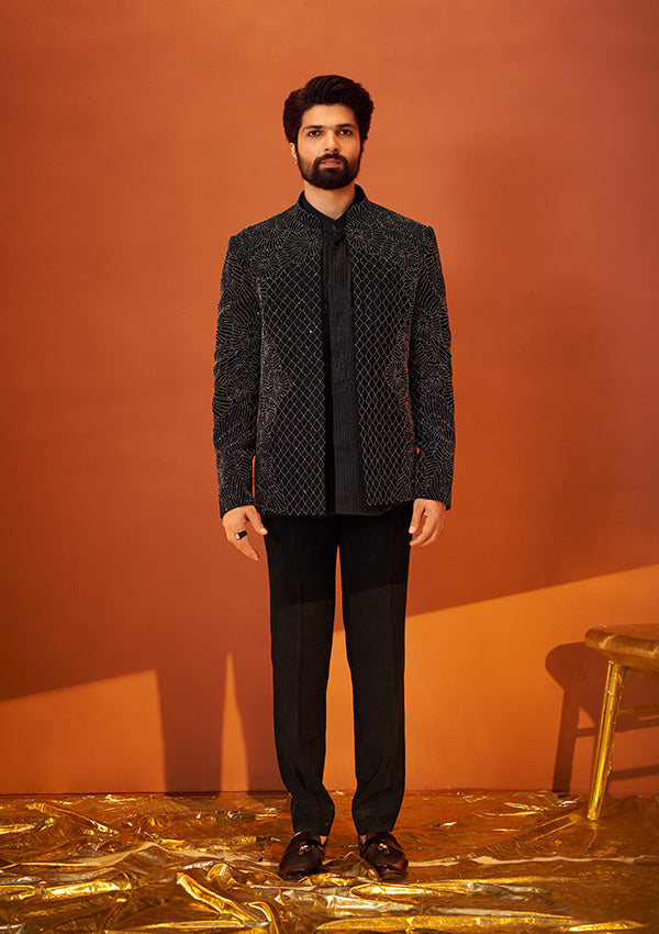 Black Armani Bandhgala with Gunmetal Pearl Embroidery