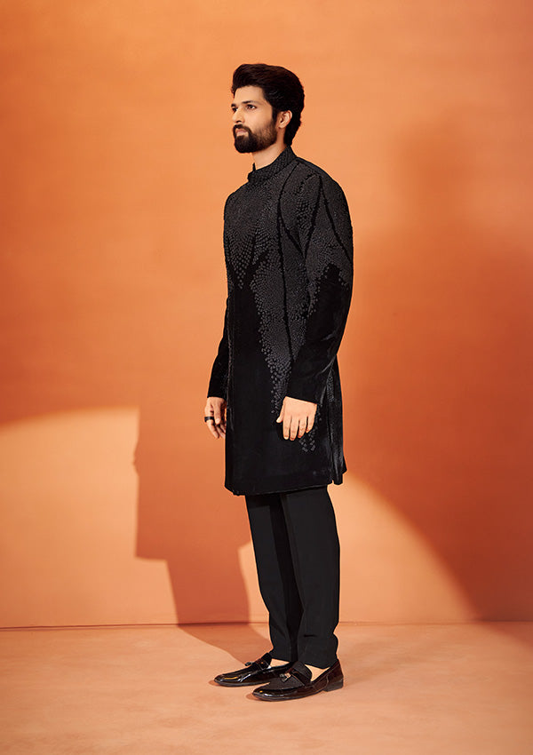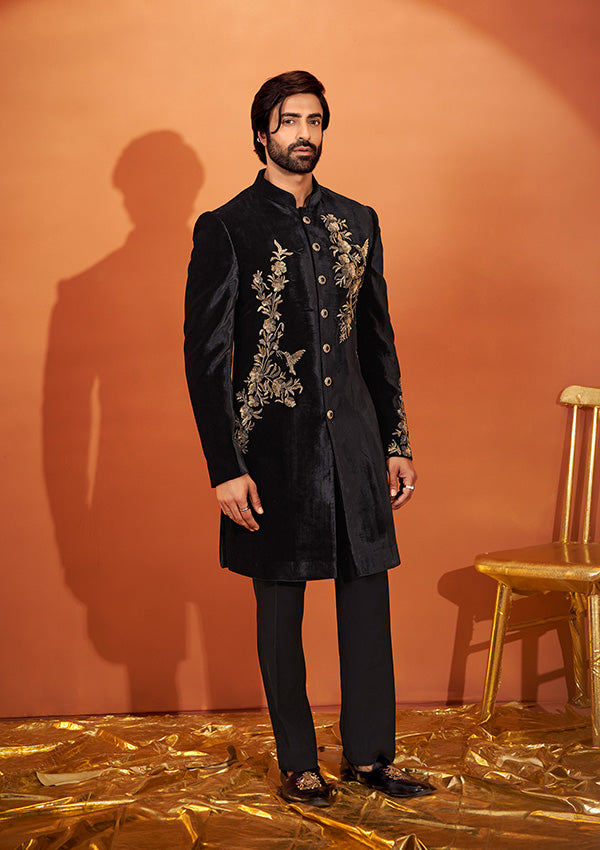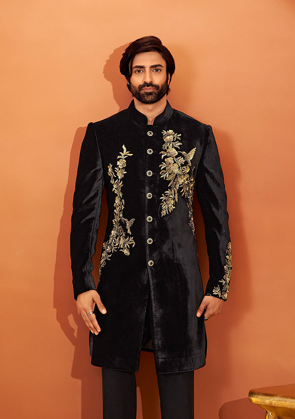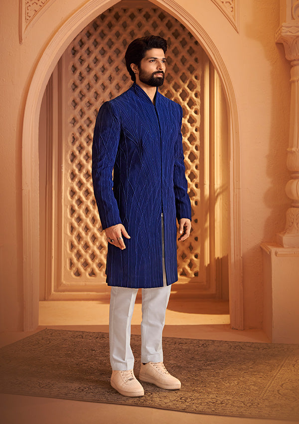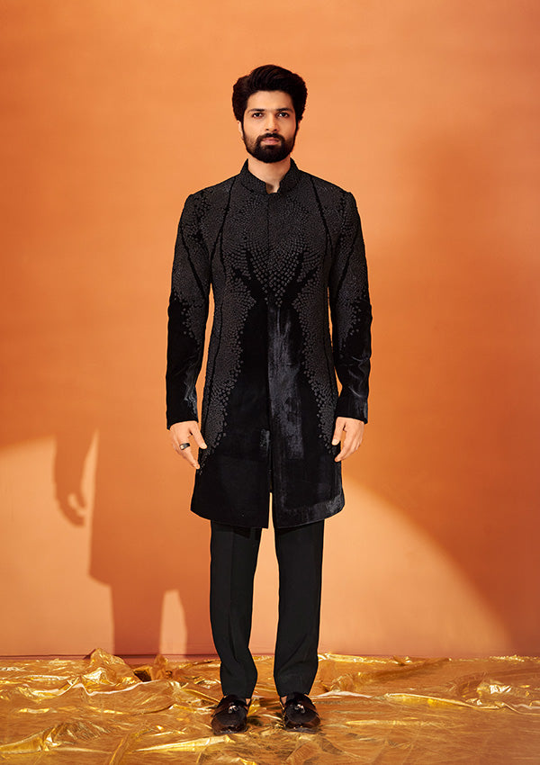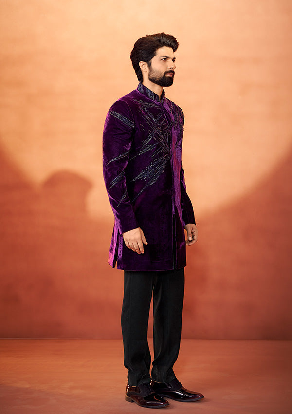 1. Luxurious Velvet: Paired with intricate embellishments like zardozi, it creates a regal appearance, often found in Indo-Western sherwani for groom.