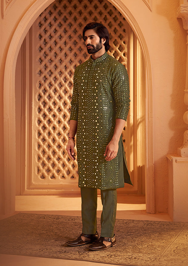 Crafted for the spotlight, this Green Fire Silk Sherwani Set showcases a dynamic interplay of mirror embellishments and fine resham thread embroidery across a luxurious base. The structured yet fluid silhouette allows the all-over mirrorwork to catch and reflect light with every step, ideal for festive evenings, sangeet, or even mehendi nights.