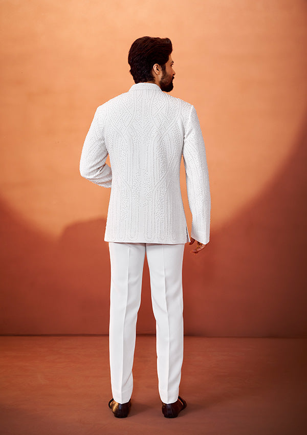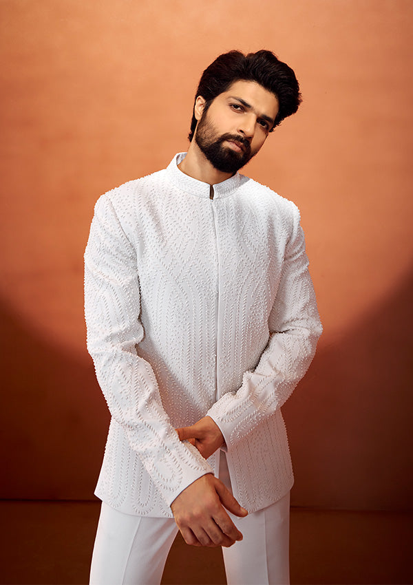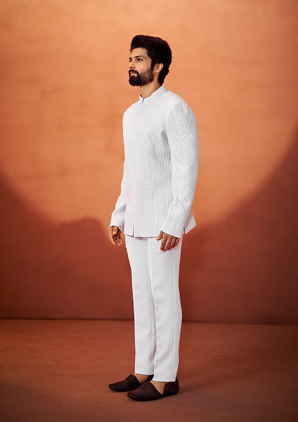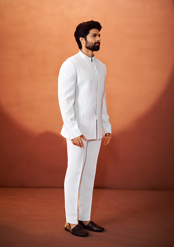 Always you to step into royalty with this Ivory Bandhgala for Wedding, featuring intricate pearl handwork over a textured fabric.