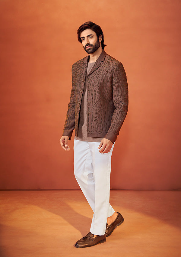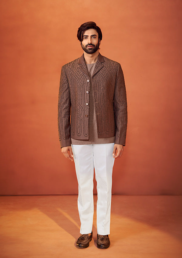 Elevate your ethnic wardrobe with this Designer Bandhgala for Men, crafted in textured light brown fabric with golden pearl embroidery. A modern alternative to the classic men’s fit, this bandhgala is perfect for weddings and festive celebrations, offering minimal yet impactful style.